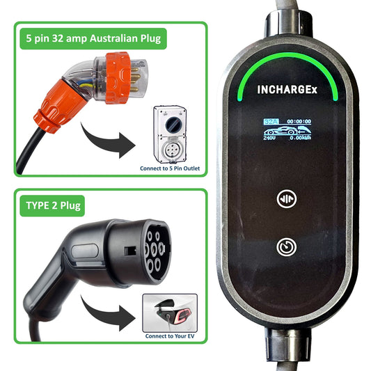 INCHARGEx 32Amp | 1 Phase | 7kW | 240v | Type 2 to Type 2 EV Charging Cable 5.4m Ev Portable Charger Black Fit BYD Tesla Model Y Tesla Model 3 Mennekes Atto 3 MG EV Accessories Australia