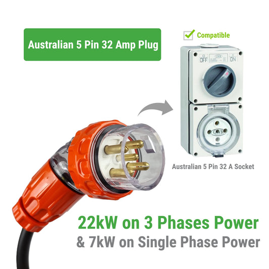 INCHARGEx Ultra Power 22kW Portable EV Charger 32amp | 5pin Tail | 3 Phase | Type 2 Universal Mobile EVSE Adjustable | 5m | Built-in RCD Type B/TypeA+DC6mA | Fit Tesla Model 3 | Model Y | BYD Atto 3 | MG EV Level 2